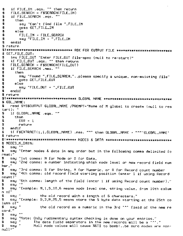 The following sample DCL script, MAKEGBL.COM, was written for a national HMO. From a sequential RMS field delimited file, MAKEGBL creates another RMS sequential file in M's %GTI format. MAKEGBL enables the creation of a M global of the user's design from any sequential RMS field delimited file.