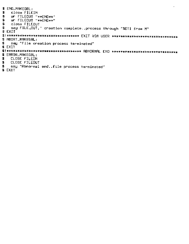 The following sample DCL script, MAKEGBL.COM, was written for a national HMO. From a sequential RMS field delimited file, MAKEGBL creates another RMS sequential file in M's %GTI format. MAKEGBL enables the creation of a M global of the user's design from any sequential RMS field delimited file.