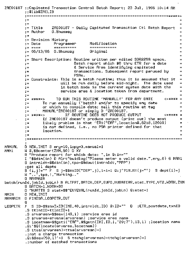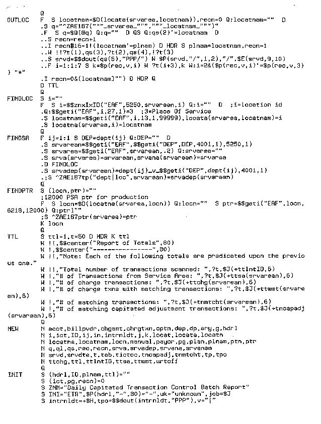 The following sample M[UMPS] routine, ZAE00187, was written for a national HMO running EPIC software. ZAE00187 is a capitated transaction control batch report.